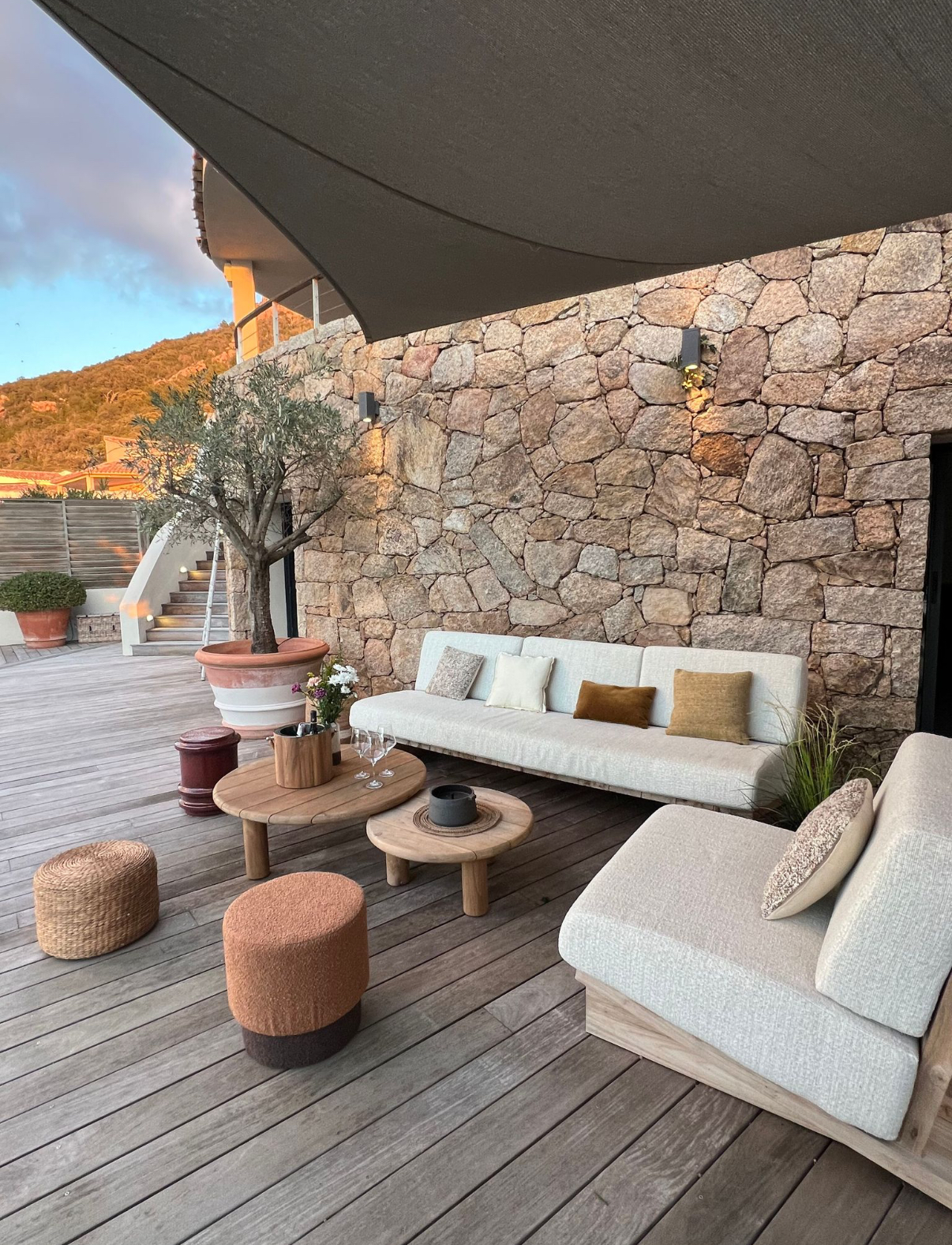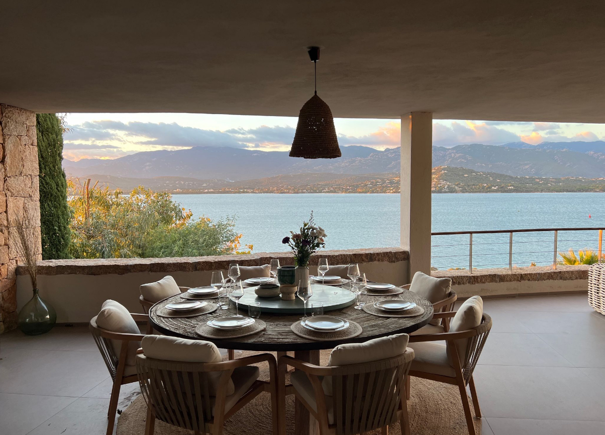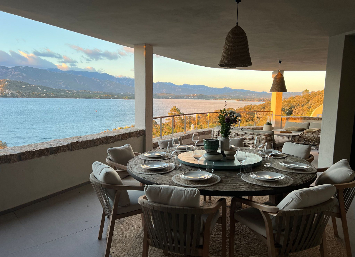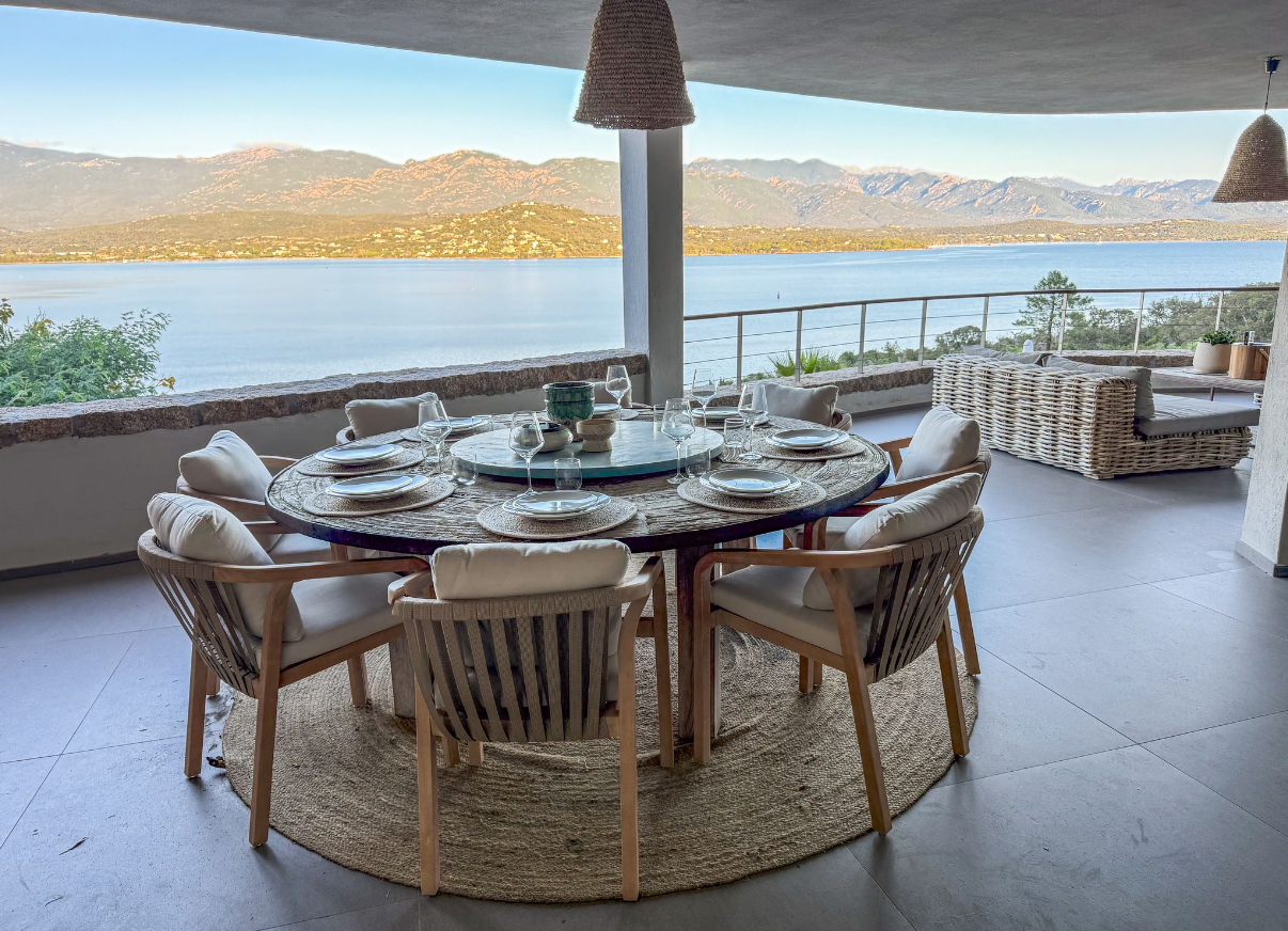 La terrasse de la Villa Blue, location de villa avec plage privée en Corse du Sud, orientée face au coucher du soleil, propose un espace repas extérieur unique. Vous pourrez y partager vos petits-déjeuners, déjeuners ou dîners avec une vue imprenable sur la mer. Les photos montrent les différents angles de cette terrasse : mobilier de qualité, coin lounge, éclairage subtil pour les soirées, et ambiance paisible propice à la détente. Cet espace est particulièrement apprécié pour les repas en famille, les apéritifs entre amis ou simplement pour admirer la beauté des paysages corses.