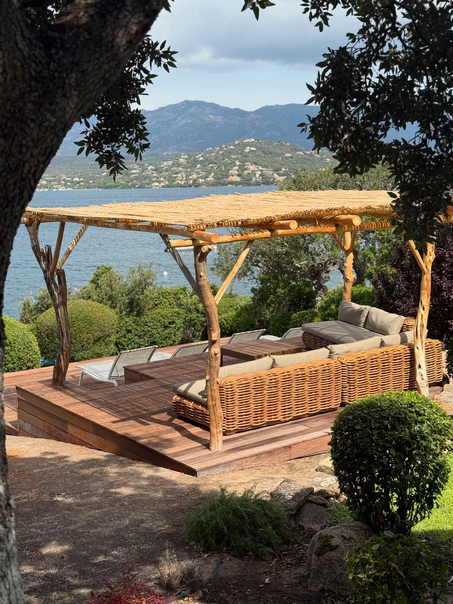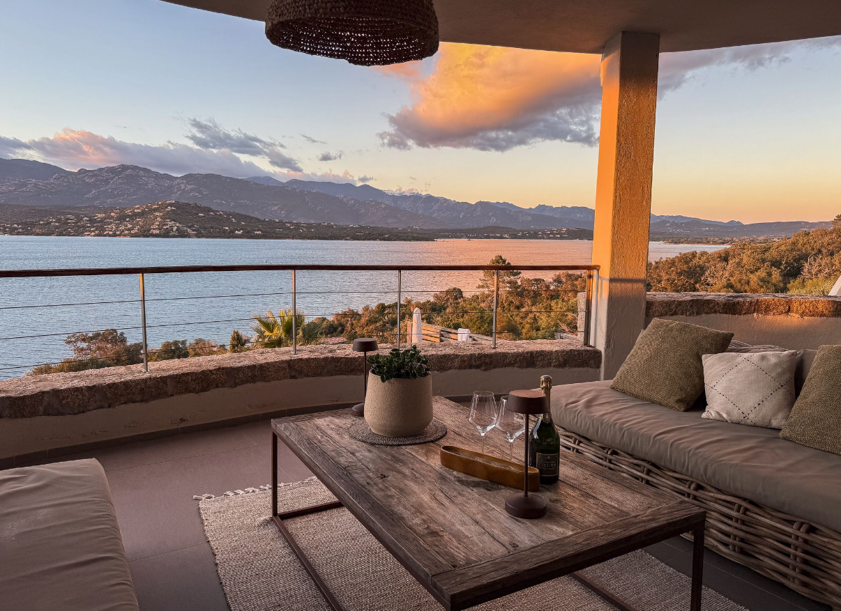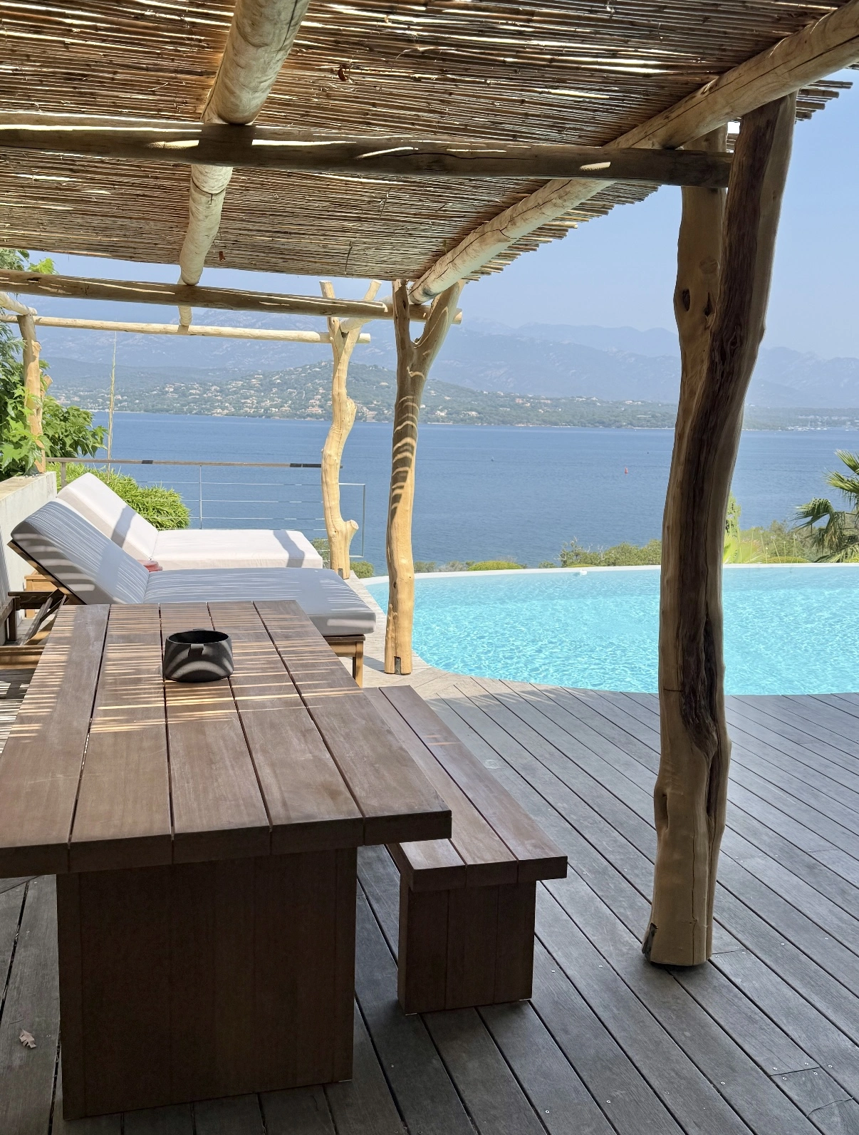 La terrasse de la Villa Blue, location de villa avec plage privée en Corse du Sud, orientée face au coucher du soleil, propose un espace repas extérieur unique. Vous pourrez y partager vos petits-déjeuners, déjeuners ou dîners avec une vue imprenable sur la mer. Les photos montrent les différents angles de cette terrasse : mobilier de qualité, coin lounge, éclairage subtil pour les soirées, et ambiance paisible propice à la détente. Cet espace est particulièrement apprécié pour les repas en famille, les apéritifs entre amis ou simplement pour admirer la beauté des paysages corses.