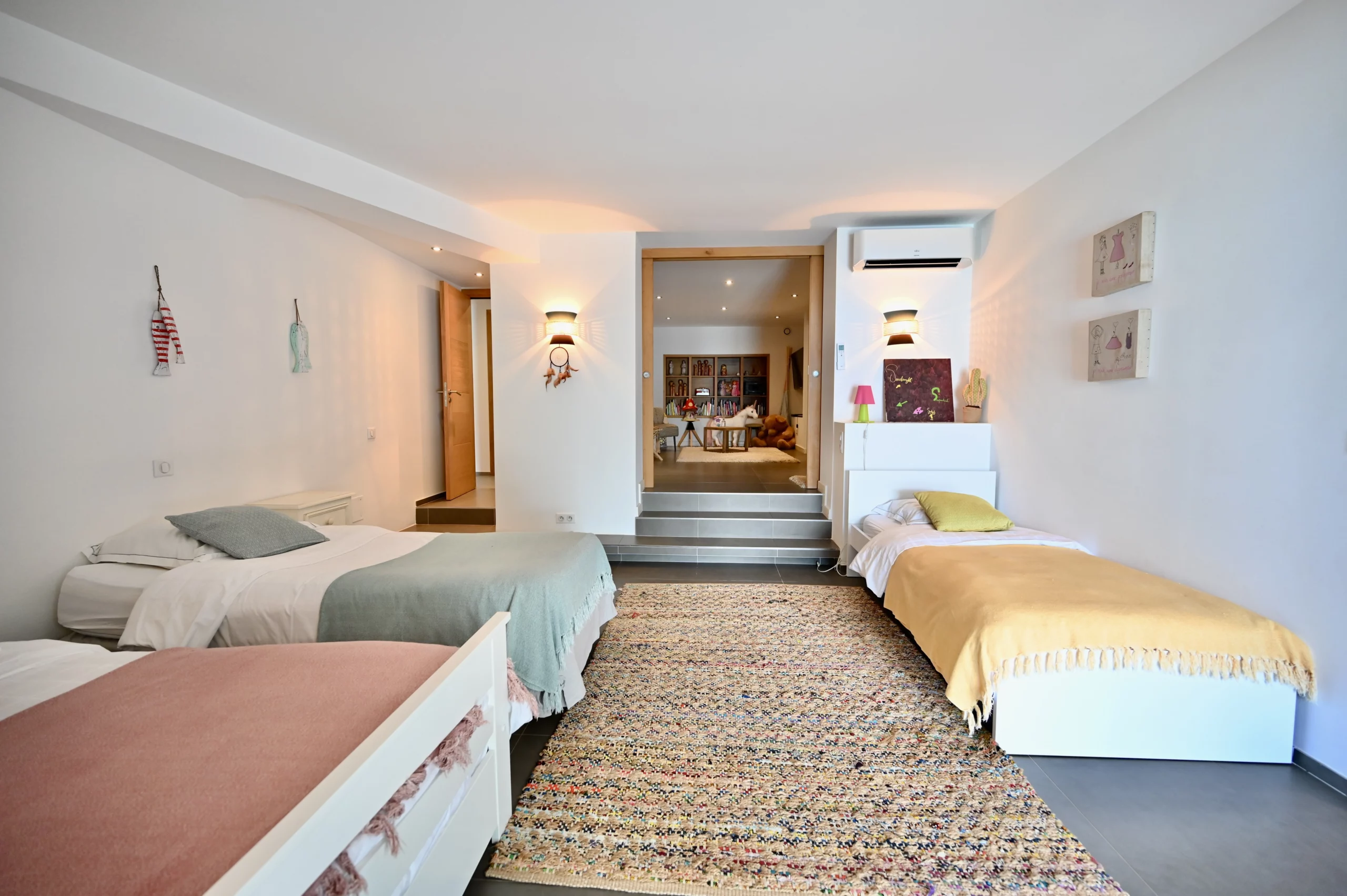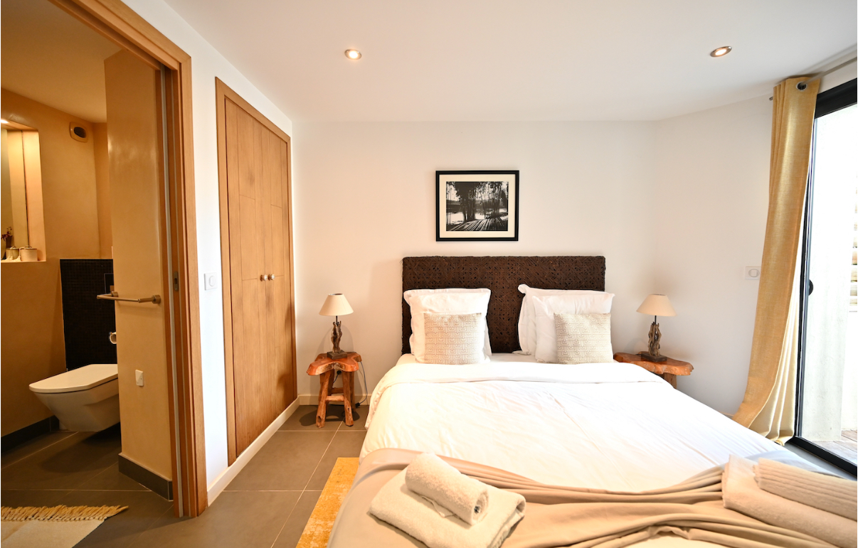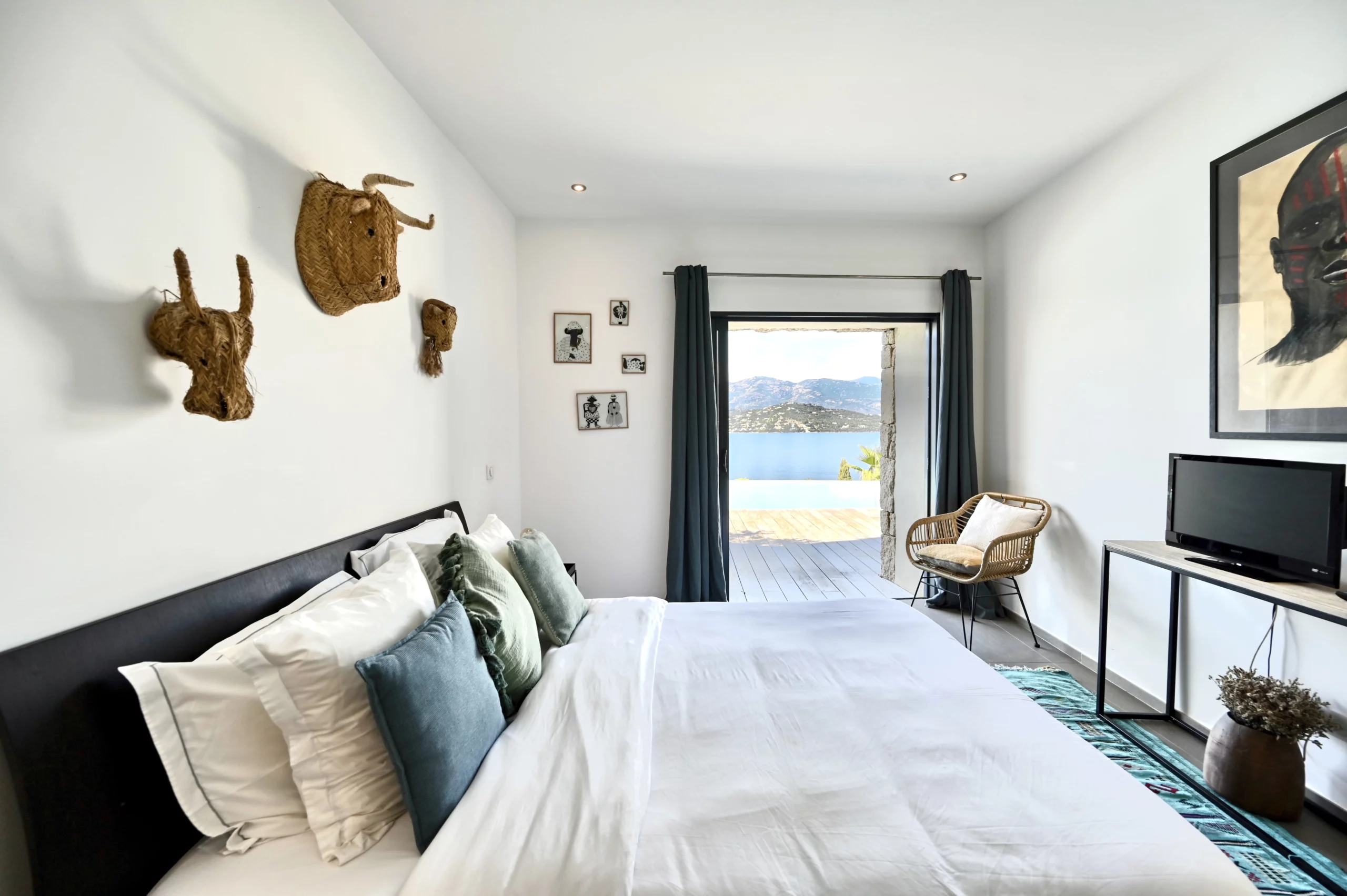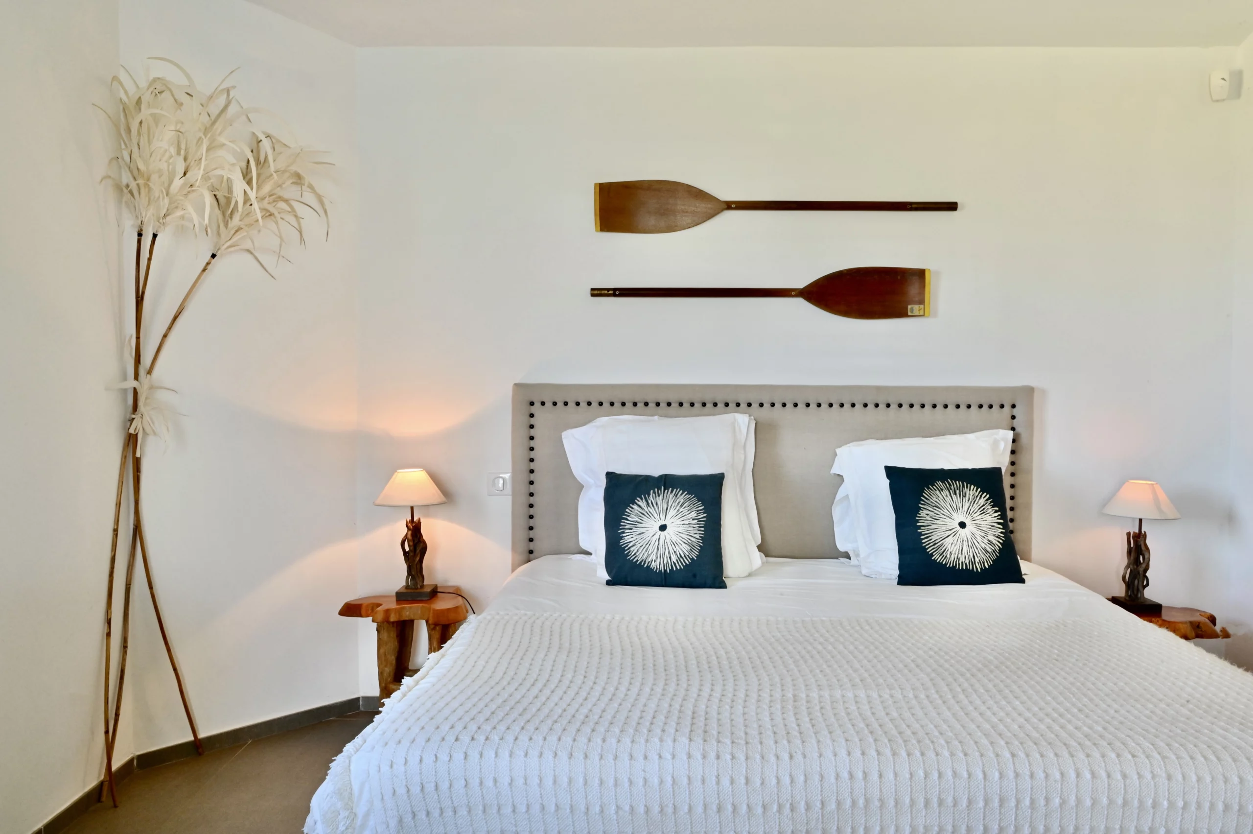 Les chambres de la Villa Blue, location de villa avec plage privée en Corse du Sud, au nombre de sept, sont conçues pour garantir confort, intimité et design. Chacune bénéficie d’une salle de bain privative, d’une literie de qualité supérieure, de la climatisation, et de rangements fonctionnels. Les images présentes dans cette galerie mettent en valeur ces espaces reposants, décorés dans un style sobre, moderne et naturel. Que ce soit les chambres vue mer ou les chambres côté jardin, chaque espace vous assure une nuit paisible dans une atmosphère raffinée. Cette villa de location en Corse du Sud est idéale pour accueillir des familles nombreuses ou des groupes d’amis à la recherche d’un séjour haut de gamme.