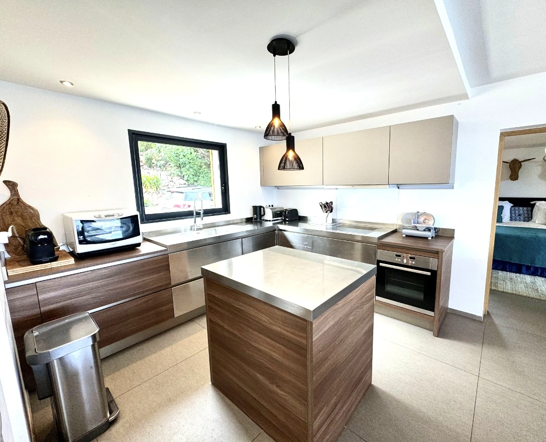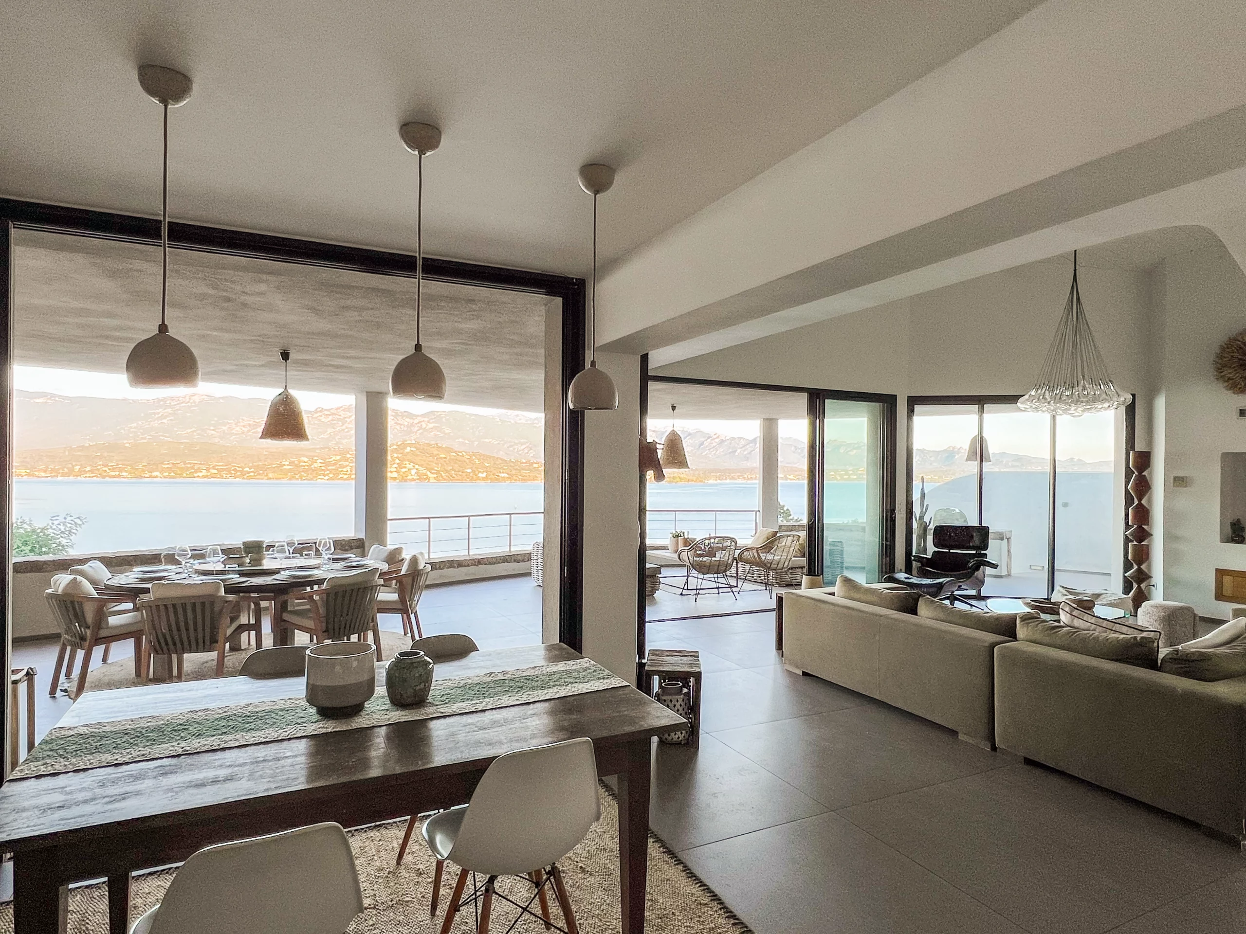 La galerie présente également les espaces de vie intérieurs : un salon lumineux avec baies vitrées, une salle à manger conviviale, et une cuisine parfaitement équipée. La villa allie confort contemporain et esprit méditerranéen, avec des matériaux nobles, une décoration soignée et une ouverture permanente vers l’extérieur. Que vous choisissiez de cuisiner vous-même ou de faire appel à un chef privé, l’expérience Villa Blue, location de villa avec plage privée en Corse du Sud, vous garantit une immersion totale dans l’art de vivre corse.